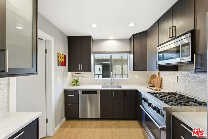 Enjoy refined coastal living in this beautifully remodeled front-facing townhome in the heart of Santa Monica, featuring 2 en-suite bedrooms and 3.5 bathrooms across 1,850 sqft of living space. The light-filled living room boasts soaring ceilings, a stone-accented gas fireplace, and opens to a private front patio for effortless indoor-outdoor living. The chef’s kitchen includes a Blue Star range, Miele dishwasher, quartz countertops, and custom cabinetry, with a wine fridge in the adjacent dining room. A lower-level bonus room with bathroom offers ideal potential for a work-from-home office, creative studio, gym, or additional guest quarters, opening to a secluded patio. A powder room and side-by-side washer/dryer are located conveniently nearby, adding to the ease of modern living. Upstairs, the primary suite offers vaulted ceilings, two closets (one walk-in), and a wraparound balcony. A second upstairs bedroom features high ceilings, an en-suite bathroom, and generous storage. Additional upgrades and features include a new Bosch heat pump HVAC, new electrical wiring, and a private 2-car garage showroom with built-in storage and checkered-flag style flooring. With all of the best dining, entertainment, and shopping that Santa Monica has to offer, along with close proximity to the ocean, this property is a true gem.