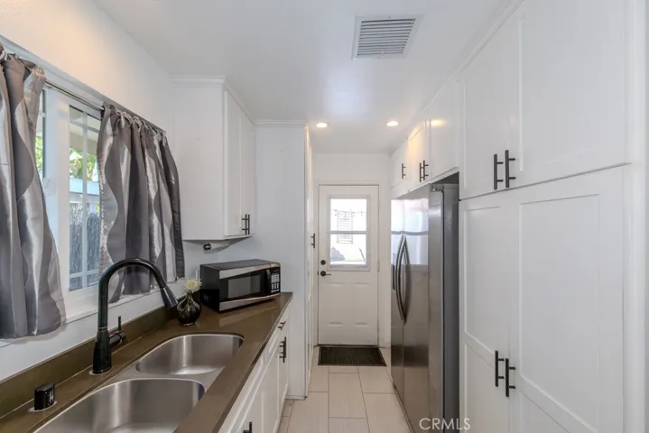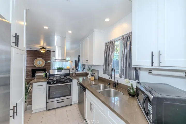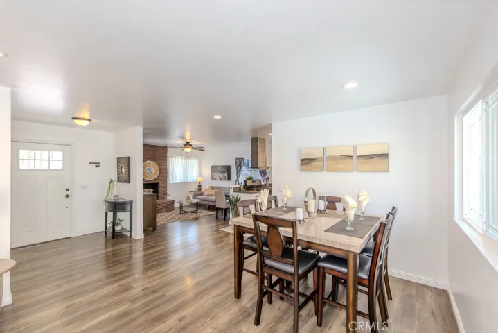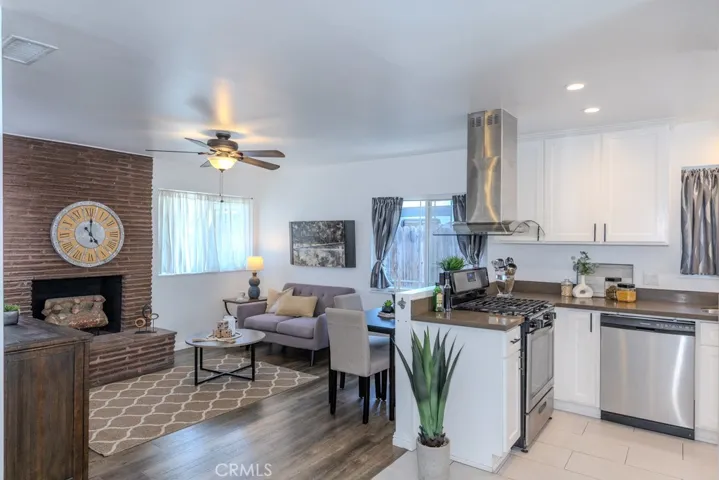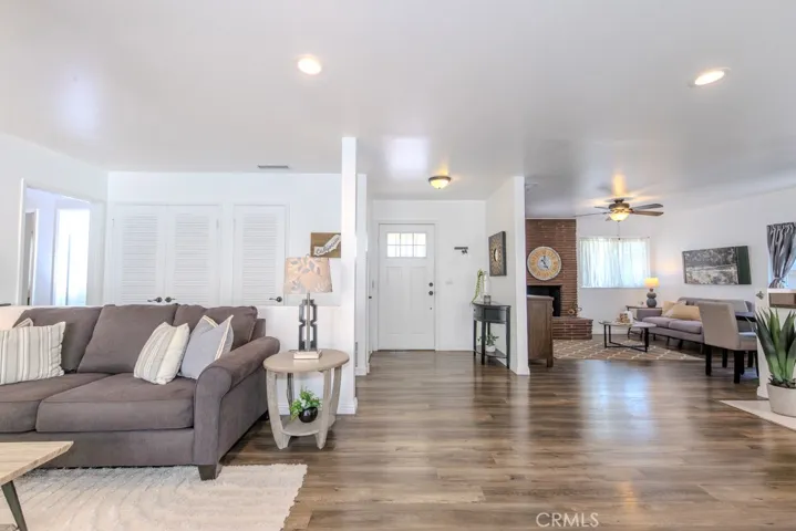 Single-story cul-de-sac home with updated kitchen and baths, RV potential parking, no HOA, and no rear neighbors. 2219 W Coronet Ave, Anaheim, CA 92801 offers 3 bedrooms and 2 bathrooms across approximately 1,372 square feet on a 6,324 square foot lot, with an expanded 42 ft by 23 ft concrete driveway, an attached two-car garage, and additional parking flexibility. From the curb, the widened driveway provides ample space for multiple vehicles, along with RV potential parking. The property is positioned near the end of a cul-de-sac and features a tall block wall along the rear, creating added separation and a defined outdoor setting. Inside, the home opens to a connected living and family room layout with consistent laminate wood flooring throughout the living areas, bedrooms, and hallway, along with recessed lighting, ceiling fans, a coat closet, and a wood-burning fireplace. The open floor plan creates a functional flow between the living, dining, and kitchen areas. The remodeled kitchen features quartz counters, stainless steel appliances, including a gas freestanding range and range hood, large plank tile flooring, recessed lighting, and ample cabinetry, with direct access to the main living areas. The primary bedroom includes dual mirrored closets, a ceiling fan, and French doors with dual-pane glass leading to the backyard. The en suite bathroom features granite counters, an updated vanity and lighting, and a tiled walk-in shower. Additional bedrooms include ceiling fans and closets with dual doors, and are positioned near a full guest bathroom with granite counters, an updated vanity and lighting, and a tub and shower combination with tile and mosaic detail. Indoor laundry is located in an enclosed closet with a stackable configuration. Additional interior features include dual-pane windows, panel interior doors, a newer furnace, updated central heating and air conditioning, an upgraded electrical panel, and repiped plumbing. The backyard is fully concreted for low-maintenance use and offers flexible space for outdoor seating and gatherings. A private above-ground heated spa is covered by a freestanding metal gazebo-style structure, and the side yard provides additional storage space. The attached two-car garage features epoxy flooring, finished walls, and multiple electrical outlets. Located in Anaheim, west of Harbor, with convenient access to shopping, dining, parks, public transit, major freeways, and the Disneyland Resort.