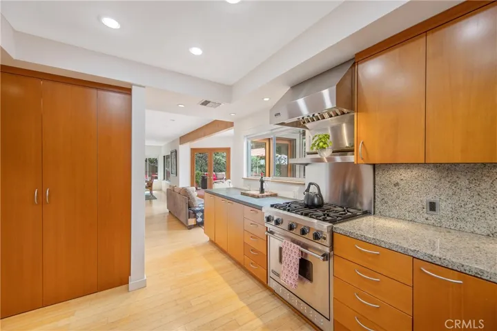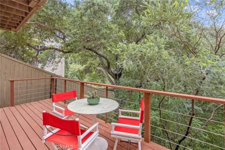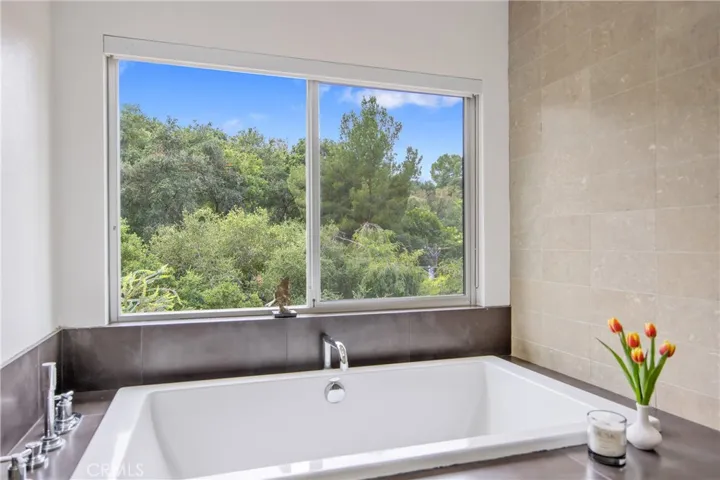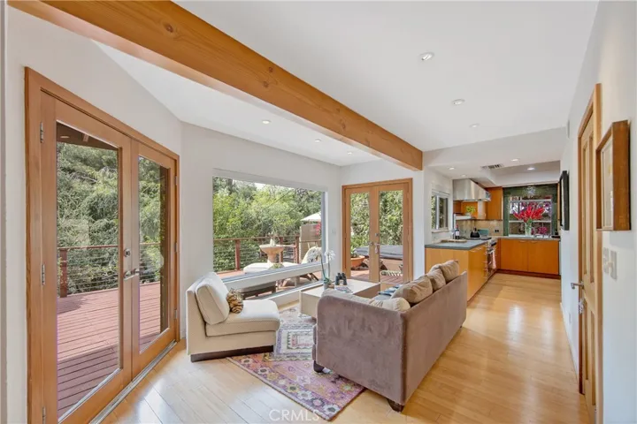 Tucked away South of the Boulevard, this remarkable architectural residence offers a rare blend of privacy, thoughtful design, and natural beauty. Positioned at the end of a quiet cul-de-sac that opens directly onto protected conservation land, the home feels like a peaceful escape while still being just minutes from the energy of the city. A gated entry welcomes you into a tranquil, Zen-inspired setting wrapped in a stunning Corten steel fence, with mature trees surrounding the home to ensure exceptional privacy. Inside, the main living space impresses with its dramatic scale and warmth. A soaring two-story vaulted ceiling enhances openness, complemented by a wood/gas-burning fireplace that anchors the room. High-set windows fill the space with natural light and offer peaceful views of the courtyard that brings the outdoor experience inside, creating a seamless connection to nature. The kitchen is designed for both beauty and performance, featuring stone countertops and high-end stainless-steel Viking and Kitchen-Aid appliances. The adjoining dining and sitting area open to a majestic private deck surrounded by lush greenery. This inviting outdoor space is perfect for relaxing mornings or quiet evenings, where you can enjoy coffee immersed in nature, and listen to the gentle sounds of birds and squirrels. The primary suite offers a luxurious retreat, generously sized and complete with a vaulted ceiling, its own wood/gas-burning fireplace, balcony, and a large walk-in closet. The upgraded en-suite bathroom delivers a spa-like experience with a deep soaking tub, and an expansive walk-in shower. Each additional bedroom continues the home’s theme of openness and comfort, featuring vaulted ceilings and walk-in closets. Throughout the residence, dual-pane Milgard windows are paired with premium Mechoshades™, offering energy efficiency and the home also features a newer roof. Expansive grounds provide an opportunity to create a pool retreat or explore adding an ADU. The home is conveniently close to some of the area’s best grocery stores, including Gelson’s, Trader Joe’s, Sprouts, and Whole Foods, making everyday living both easy and enjoyable. Access scenic hiking trails and even venture all the way to the coast, with Topanga State Beach and Malibu just 20-25 minutes away! It is a place to unwind, recharge, and feel completely removed from the city while still being close to everything!