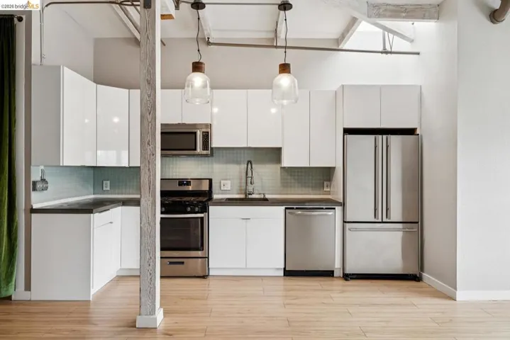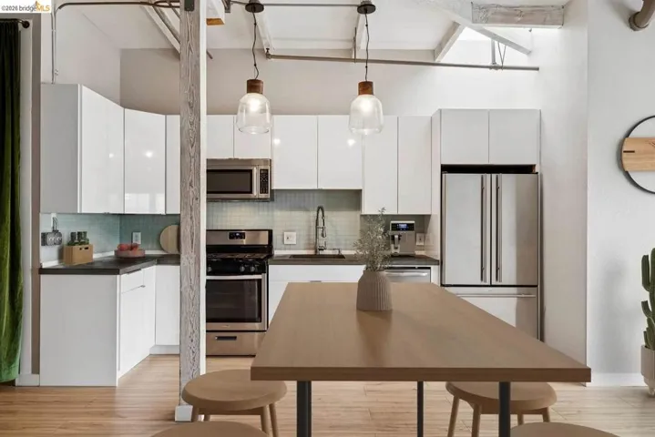 This live/work loft offers a highly functional layout with a dedicated ground-floor workspace and a bright, open living area above-designed to adapt to real daily needs. The street-level workspace features a roll-up door and curb cut access, making it easy to move equipment, materials, or gear in and out. With durable finishes, built-in storage, and generous ceiling height, it’s a space suited for projects, hobbies, or a flexible work-from-home setup. Upstairs, the living space is open, comfortable, and filled with natural light. Warm wood floors, exposed beams, and clean finishes create a setting that feels both practical and inviting. The kitchen connects directly to the main living area, supporting an easy flow for cooking, dining, and relaxing. The separation between levels allows for focus and privacy when needed-work below, live above-without sacrificing connection between the spaces. Additional nooks and storage areas provide flexibility for workspace or organization. The community includes a landscaped courtyard, BBQ/picnic area, and secured gated parking with two spaces. Just minutes from BART, downtown Oakland, and Emeryville, this is true loft living-industrial charm meets modern comfort in one of the East Bay’s most connected locations.
