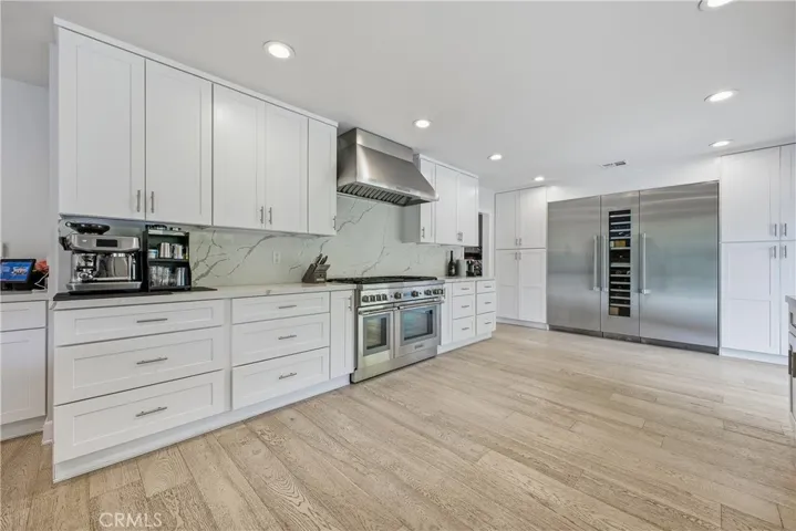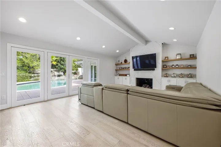 Discover this stunning and spacious 5-bedroom, 5.5-bathroom family home, ideally positioned at the end of a quiet and highly sought-after cul-de-sac. Step inside to a bright, airy interior featuring beautiful European oak flooring throughout and a thoughtfully designed open-concept layout, perfect for both everyday living and effortless entertaining. The expansive kitchen and family room seamlessly lead to a private, low-maintenance backyard oasis, complete with a sparkling pool and spa, as well as an inviting outdoor patio and lounge area featuring a fireplace and outdoor shower, ideal for enjoying outdoor living year-round. The kitchen is equipped with sleek countertops, high-end appliances, and a wine refrigerator, blending style with functionality. Both the formal living room and family room showcase elegant fireplaces with dramatic floor-to-ceiling marble feature walls, adding warmth and sophistication. The luxurious primary suite serves as a serene retreat, highlighted by French doors that open to the backyard and a newly remodeled, spa-inspired bathroom. This elegant space features porcelain tile throughout, dual vanities, dual separate toilet rooms, a walk-in shower, a freestanding soaking tub, and a spacious walk-in closet. Three additional bedrooms offer en-suite bathrooms, including one privately situated on the opposite side of the home, perfect for guests or multigenerational living. An additional hallway bathroom is beautifully finished with marble flooring, porcelain tile, and a steam shower, creating a true at-home spa experience. Additional highlights include newer solar panels, a well-appointed garage with built-in storage, and an overall sense of peace and privacy that makes this home truly exceptional. Located in a prime area, this is a must-see property you won’t want to miss.