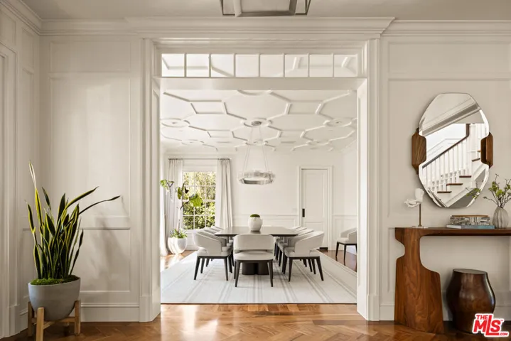 Tucked away in the highly sought-after Lower Riviera of Pacific Palisades, this exceptional traditional estate captures the spirit of understated luxury through impeccable craftsmanship, refined details, and a calm, sophisticated atmosphere. From timeless finishes to thoughtfully executed upgrades and distinctive architectural windows, the home has been designed with both beauty and livability in mind.Spanning three expansive levels, the residence offers a natural sense of flow and balance. On the main floor, bathrooms accented with amethyst and rose quartz bring a subtle, tranquil elegance. Formal spaces include a richly detailed study and a graceful dining room, complemented by a hidden butler’s pantry and separate wet barideal for both intimate dinners and larger gatherings.At the center of the home, the chef’s kitchen stands out with its honed marble hood, top-tier appliances, and a welcoming breakfast nook. Just beyond, the family room opens effortlessly to a secluded outdoor setting featuring a bluestone terrace, pool and spa with automated cover, built-in BBQ, wood-fired pizza oven, and mature hedging for privacy.Natural light pours into the upper level through skylights, where two ensuite bedrooms and a versatile bonus roomcomplete with custom wallpaper and whiteboard wallsoffer flexibility for work, study, or play. The primary suite is a true retreat, highlighted by vaulted ceilings, linen-upholstered walls, a statement fireplace, motorized blackout shades, and a private balcony with subtle ocean glimpses. Its spa-like bath features hand-laid Michael Aram floral marble, heated floors, dual walk-in closets, and a dual-suite configuration with individual Japanese toilets.The lower level is designed for both relaxation and recreation, showcasing a cutting-edge home theater with a full-scale screen, cinema-quality projection, custom seating, and rich black mohair walls. This floor also includes a generous flex space, an additional bedroom, a custom wine cellar, and a fully equipped gym with mirrored walls and a ballet barre.Additional features include a comprehensive security system, Crestron whole-home audio and video integration, three retractable outdoor awnings, a vegetable garden, and completed post-fire inspection with air-quality remediation for added reassurance.Blending classic elegance with modern comfort, this home presents a rare opportunity to live in one of Los Angeles’ premier neighborhoods, just moments from the renowned Riviera Country Club. Offered partially furnished, it includes a thoughtfully curated selection of designer and custom furnishings throughout.