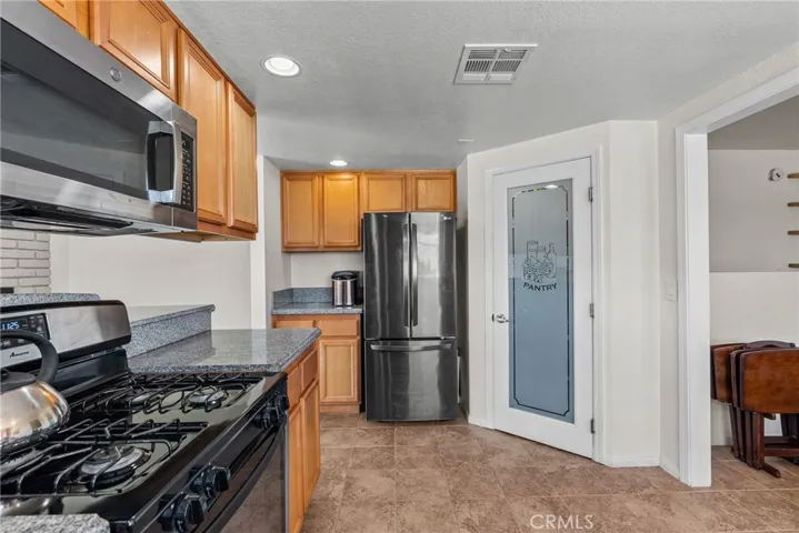 The kitchen offers generous countertop space, bar-top seating, and a walk-in pantry for added convenience. The primary bedroom includes its own bathroom and a barn door leading to the walk-in closet. Two additional bedrooms provide flexibility, including one with a walk-in closet, along with a hall bathroom.