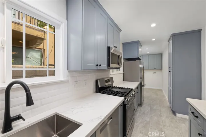 The kitchen has been completely remodeled with sleek cabinetry and stainless steel appliances, including a refrigerator, dishwasher, stove, and microwave. Just off the kitchen is a dedicated laundry area with washer and dryer hookups for added convenience. The bathroom has also been beautifully updated and features a spacious walk in shower.