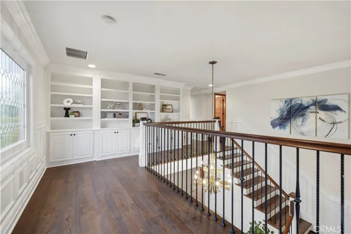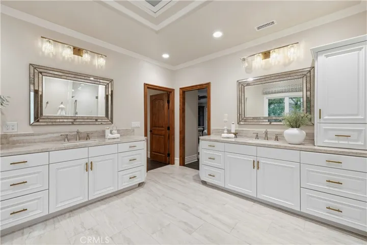 The luxurious primary suite offers a private retreat with its own fireplace and custom built-ins. The recently remodeled spa-inspired bathroom features a standalone soaking tub, oversized walk-in shower, and spacious walk-in closet.