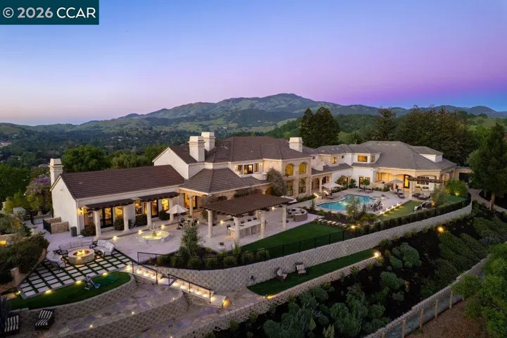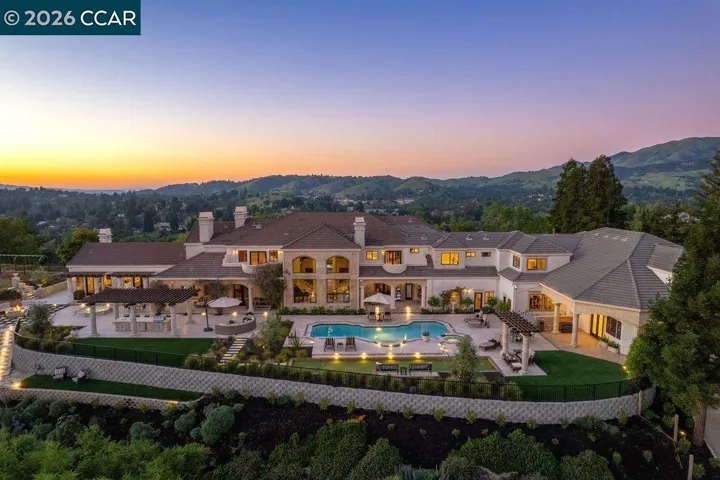 A secluded drive ascends to the hilltop gated estate, Bella Vista de Valle, a Mediterranean masterpiece defined by effortless living, exceptional lifestyle, and quiet luxury. Sweeping 360-degree views, highlighted by Mount Diablo, are perfectly positioned as though the landscape were a work of art framed exclusively for this remarkable residence. A grand foyer impresses with soaring 19-foot ceilings, stately columns, and picturesque windows that frame breathtaking valley vistas. Set on approximately 5.31 acres and spanning 13,410± square feet, the estate offers 7 bedrooms, 7 full baths, and two half baths, along with expansive living spaces and a newly renovated gourmet kitchen. Dual Calcutta Supreme islands anchor the space beneath designer chandeliers, complemented by custom fluted-glass cabinetry, ambient lighting, and a full suite of professional-grade appliances with an adjacent hidden pantry that reveals itself like a well-kept secret. Exceptional amenities include an INDOOR BASKETBALL court, au pair suite, exercise room, billiard/bonus room, richly detailed office, & more. The resort-style grounds showcase a spectacular pool, spa, fire pit, bocci court, putting & chipping greens, a soccer field, a children’s playground, an outdoor kitchen, & multiple covered loggias.