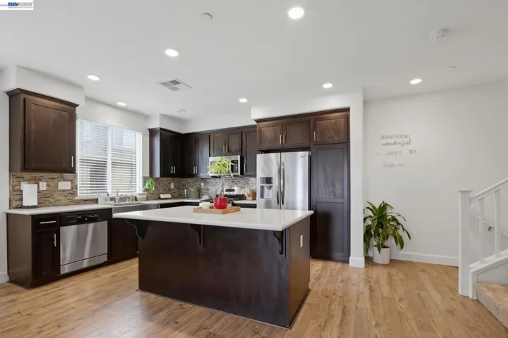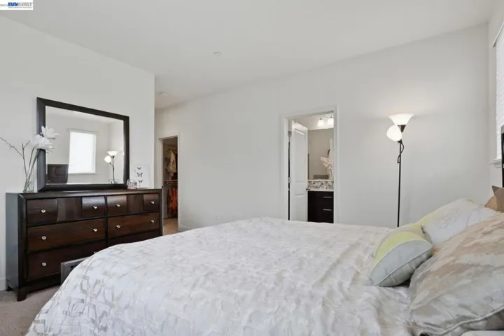 Best buy in Newark. This stunning 3-bedroom, 3-full bathroom modern home is situated in a Prima community in Newark, featuring a highly desirable location w/ no front neighbors & a beautiful, amazing view of the sunrise & the mountain. The home offers an open concept layout & high ceilings, with 1 bedroom/ 1 full bath on the main level. Tasteful upgrades are found throughout, including a chef-grade kitchen w/ shaker cabinets, full backsplash, natural stone countertops, high-end SS appliances, large island & upgraded barn sink. The formal dining area & private balcony are perfect for entertaining. Beautiful engineered hardwood floors adorn the main level, and upgraded carpets are featured throughout the home. Central AC & heating provide comfort year-round. The primary suite boasts a spacious walk-in closet & double sink vanities, offering a luxurious & relaxing experience. The location is highly convenient, just a few minutes’ walk to all amazing restaurants, AMC, Costco, and New Park Mall, w/ easy access to all major high tech firms, freeways, Dumbarton Bridge & BART. It’s also within walking distance to company commute bus stops, and close to the desirable Challenger School & parks. No rental restriction. Won’t last long.