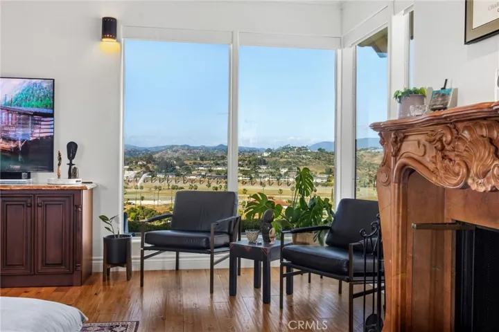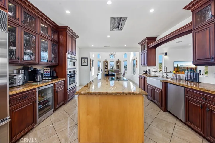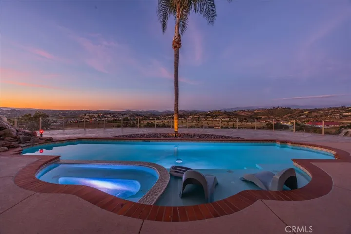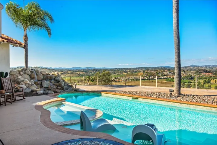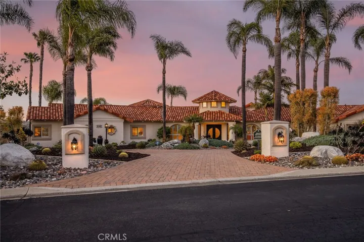 A grand Mediterranean-style entry introduces the home’s architectural concept of sequential framing, guiding the eye through elegant openings from the formal dining room to the living spaces and onward to surrounding vistas. The bespoke primary suite serves as a luxurious retreat featuring an imported Italian marble fireplace, French doors opening directly to the pool terrace, dual walk-in closets, and a spa-inspired bath with split vanity sinks, heated floors, a multi-jet soaking tub, and steam shower. An oversized laundry room with abundant cabinetry provides excellent storage. Refined craftsmanship is showcased throughout with marble and hardwood flooring, exposed beams, Venetian plaster walls, and distinctive turret architecture with soaring dome-vaulted ceilings. The chef’s kitchen features a generous breakfast nook, oversized marble-topped island with a new Miele induction range, Sub-Zero refrigerator drawers, walk-in pantry, and custom cabinetry designed for both display and convenience. The adjacent family room offers generous scale with a fireplace, built-in hutch, and media wall. Outdoors, the meticulously landscaped grounds create a resort-like setting with privacy from neighbors on a forward extended patio. The landscape boasts drought-conscious succulent gardens, a rose garden, sleek glass fencing, and a newly resurfaced pool accented by a natural stone waterfall. A built-in BBQ with bar seating invites effortless entertaining, while expansive patios provide the perfect setting to enjoy the home’s extraordinary views and tranquil surroundings. A spacious three-car garage includes additional storage cabinets and an EV charging station. This is elevated living—where luxury, comfort, and peaceful scenery converge into a dream fulfilled.