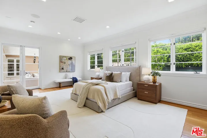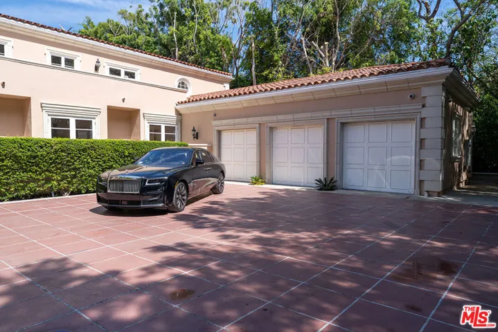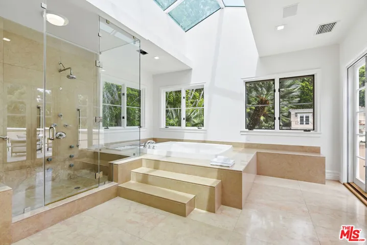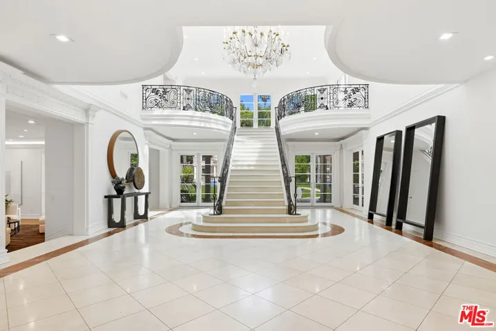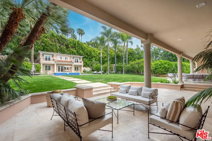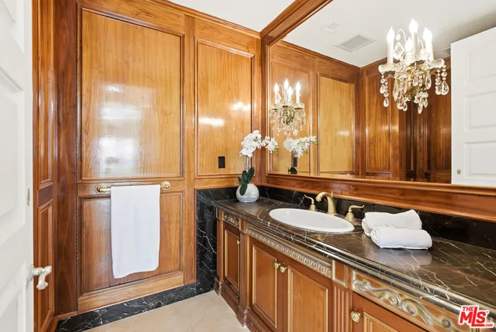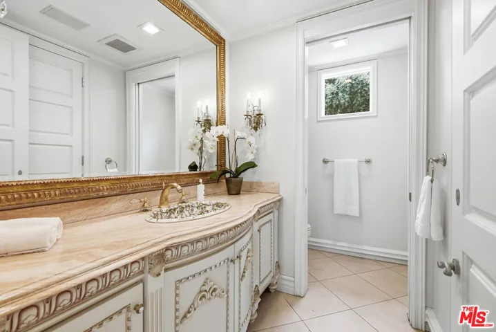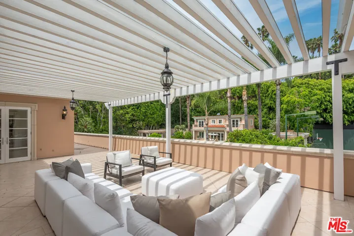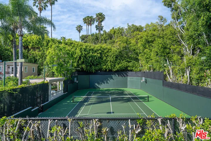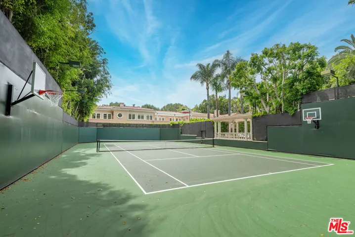 Perched above a long gated driveway, this Grand Mediterranean sits on over an acre of gorgeous resort-like grounds with night lit tennis court. Step inside double doors to discover impressive 2-story entry with skylights and marbled staircase. Enormous stepdown living room highlighted by fireplace, beautiful wood paneled office with wet bar, large formal dining room and decorative kitchen with top-of-the-line appliances, oversized center island and adjacent breakfast room. Extraordinary primary suite features another full living room with fireplace and two separate sumptuous baths highlighted by skylights, jacuzzi tubs, sauna and large walk-in closets. There are 4 additional family bedrooms upstairs, each en suite with walk-in closets and balcony access. Second staircase leads down to spacious family room with fireplace and game room/nook. French doors from almost every living space lead to expansive verandas with outdoor seating, built-in BBQ and pizza oven, and manicured gardens with lush grassy lawn perfect for entertaining! Detached 2-story 2bedroom guest house with kitchen overlooks enticing sparkling pool and spa. Temp controlled wine cellar, 2 staff quarters with shared living space, 2 laundry rooms, solar panels and 3-car garage complete this magnificent estate.