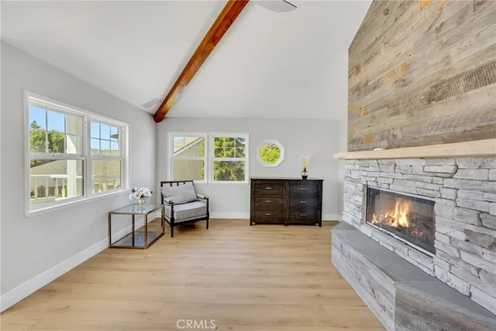 The thoughtfully designed floor plan includes a desirable main-level bedroom and full bath, while the expansive upstairs bonus room features a striking floor-to-ceiling stone fireplace. Elegant upgrades throughout the home include spa-inspired bathrooms, rich wood flooring, a tongue-and-groove paneled ceiling, and timeless architectural details.