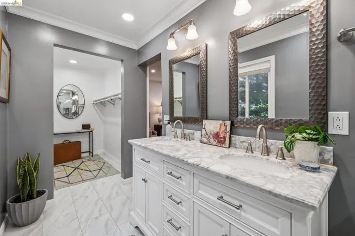18 North Circle is a rarity in the Oakland Hills. Its situation on a large, mostly level cul-de-sac, as well as a level front yard with charming picket fence make it feel quite traditional for a hills house. The living room has a fireplace and direct access to the wrap-around deck for outdoor living. The eat-in kitchen is oversized with a large island, a pantry, and windows on three sides to let in the light. The primary bedroom has an updated marble bathroom with step-in shower and a walk-in closet. Three more bedrooms offer great flexibility. The side yard is terraced and ready for your kitchen garden, while the backyard has a patio and delightful play structure. There are contemporary upgrades like air conditioning and a tankless water heater, and extra parking for your camper or RV. Just up the street from the Hills Swim and Tennis Club, this is your tranquil home in the hills.