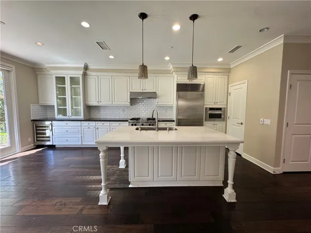 Nestled within the prestigious 24-hour guard-gated community of Laguna Altura, this exquisitely upgraded residence offers a refined blend of elegance, comfort, and modern luxury. Featuring 4 bedrooms and 3 bathrooms, including a desirable main-level bedroom, this home is designed for both everyday living and sophisticated entertaining. At the heart of the home is a highly upgraded gourmet kitchen, beautifully appointed with granite countertops, a full designer backsplash, elegant glass-door cabinetry, and two stylish pendant lights that add warmth and ambiance. Premium appliances include a Sub-Zero refrigerator and a built-in wine cooler—perfect for the culinary enthusiast. The kitchen opens seamlessly to the inviting family room, creating a bright, airy great room. Natural light pours into the breakfast nook through dramatic floor-to-ceiling windows, while French glass doors lead from the formal dining room to a thoughtfully curated, artistic backyard—an ideal setting for morning coffee, intimate gatherings, or relaxed outdoor living. The interior showcases rich wood flooring throughout (with tile in the bathrooms and premium carpet on the staircase), complemented by a cozy fireplace in the family room and designer window treatments, including Ethan Allen coverings, Hunter Douglas blinds, and classic wood shutters. The elegant tray ceiling in the primary suite and the coffered ceiling in one secondary bedroom add architectural sophistication and a sense of spaciousness. All bathrooms are tastefully upgraded, and custom closet systems enhance every bedroom. Additional features include a water-softening system, a drinking water filtration system, epoxy-finished garage floors, and built-in cabinetry in the attached two-car garage for added convenience and storage.