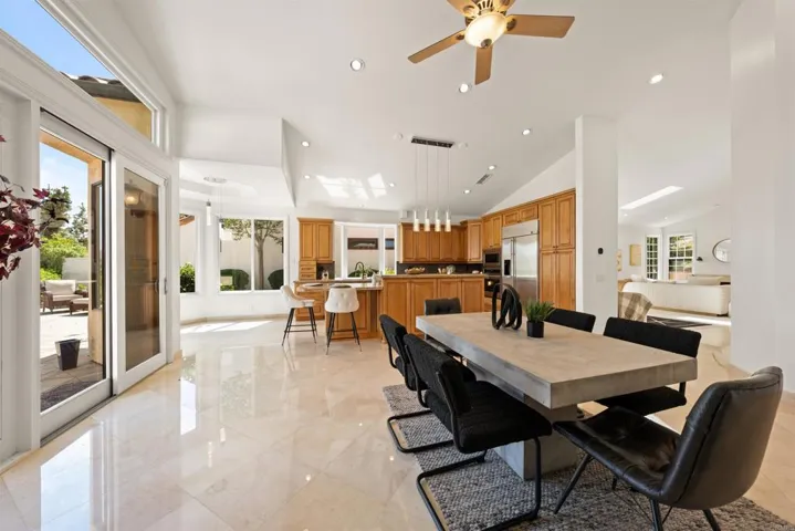 Experience stunning panoramic views in this beautifully situated single-story home in the highly sought-after Eastview community. Showcasing sweeping easterly vistas of the mountains and golf course, this property offers a serene and elevated lifestyle. Step outside to a spacious backyard retreat designed for both relaxation and entertaining. Multiple seating areas create the perfect setting to enjoy peaceful sunrises or host unforgettable gatherings. The covered terrace features a soothing fountain, garden bed, and generous open space to make the most of indoor-outdoor living. Inside, the chef-inspired kitchen is thoughtfully designed with premium stainless steel appliances, double ovens, an oversized island, and high-quality cabinetry, all complemented by elegant natural stone countertops. The open-concept layout is filled with natural light, highlighted by soaring ceilings and beautiful marble flooring throughout. The primary suite offers a private escape with breathtaking views, walk-in closet, a custom walk-in shower, and dual vanities. Guest bedrooms enjoy access to a peaceful courtyard, creating a welcoming and private space for visitors. The property is surrounded by mature landscaping, offering both beauty and privacy. Ownership includes membership to both the Eastview Community Center and RB Swim & Tennis Club, providing access to tennis, pickleball, swimming, fitness facilities, and more. Schedule your showing don’t miss out!