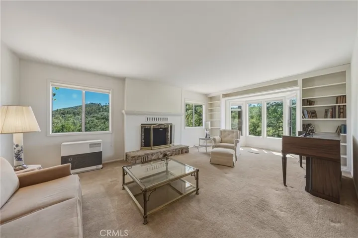 The kitchen is designed for functionality with an island, electric range with oven, wall oven, dishwasher, tile countertops, and abundant cabinet and counter space. Book lovers will appreciate built-in bookshelves in nearly every room, adding charm and character throughout the home.