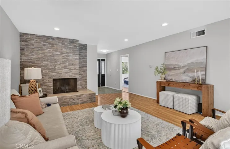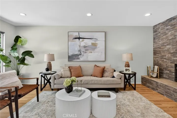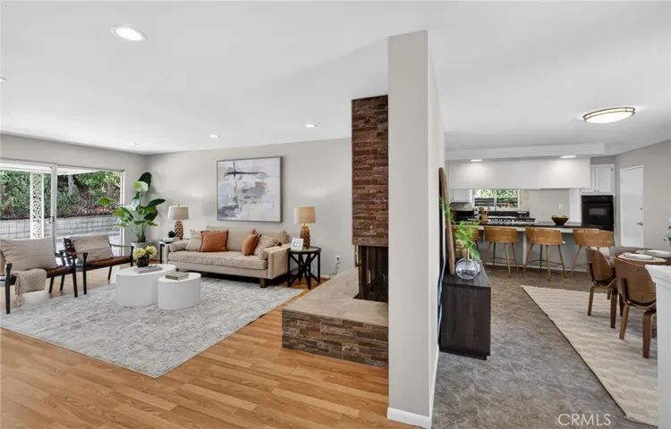 Step inside to a bright and functional layout filled with natural light, highlighted by hardwood flooring, recessed lighting, and expansive windows. The spacious living room features a statement fireplace and flows seamlessly into the dining area, creating an ideal space for both everyday living and entertaining.