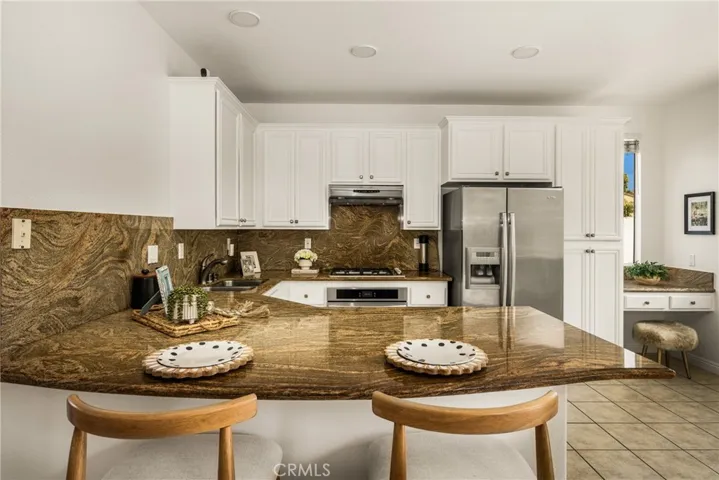 Situated on a quiet street in Woodbridge, 18 Bayfield is one of just 9 homes built in 1999 in the exclusive cul-de-sac enclave of South Lake Villas. Located approximately 600 feet from South Lake, the home offers immediate access to one of the community’s most desirable settings. The property features 4 bedrooms and 3 bathrooms with 1,875 square feet of living space on a 3,522 square foot lot. From the front porch, the entry opens to a spacious living room with vaulted ceilings, upper windows, and a staircase with wood handrail. Natural light fills the space, with gleaming laminate flooring running throughout the home. A fireplace anchors the room, which flows into a dining area located between the living room and kitchen. At the rear of the home, the kitchen includes white shaker-style cabinets, granite countertops with full backsplash, and stainless steel appliances including a gas range with hood, built-in microwave, and dishwasher. A peninsula with bar seating connects the kitchen to the family room, where sliding glass doors open directly to the backyard. A main-level bedroom and nearby full bathroom with bathtub/shower combo are ideal for guests, a home office, or extended living. Upstairs, the primary suite is located at the rear and features vaulted ceilings, a large walk-in closet, multiple windows, and a peek-a-boo view of South Lake. The primary bathroom includes dual sinks, a soaking tub, and a walk-in shower with glass enclosure. Secondary bedrooms also have vaulted ceilings, large windows, and mirrored closet doors. The upstairs hall bathroom includes a tub/shower combo. The backyard is fully finished with hardscape, along with planter areas and mature landscaping. It’s clean, functional, and easy to maintain, and offers privacy. Additional features include an upstairs interior laundry room with a sink and an abundance of cabinetry, ceiling fans, recessed lighting and a two-car attached garage with direct access. There is plenty of guest parking. Residents enjoy access to Woodbridge’s resort-style amenities including the South Lake lagoon, 22 pools and spas, 24 tennis courts, 12 pickleball courts, volleyball courts, splash pads, playgrounds, and dozens of parks and walking trails. With a low tax rate and low HOA, the home also offers strong overall value. No Mello-Roos.