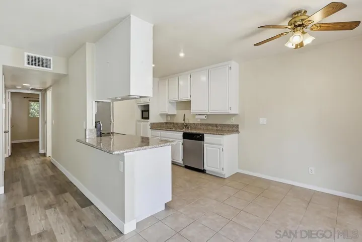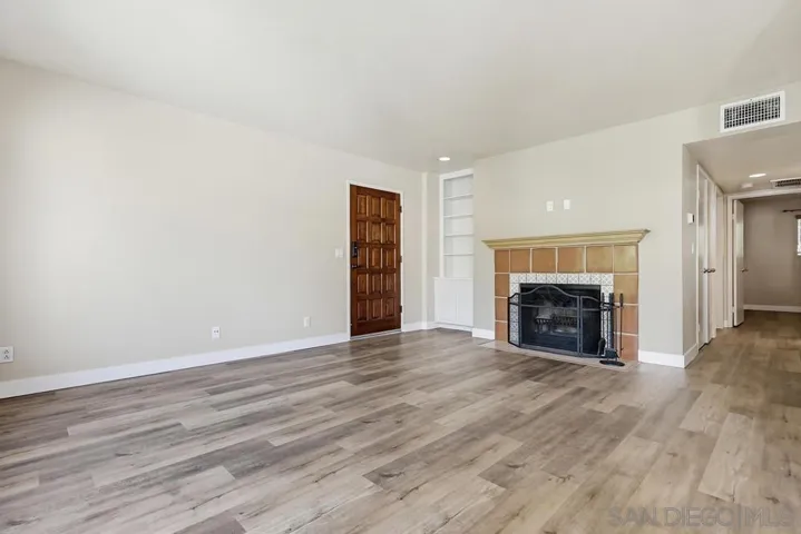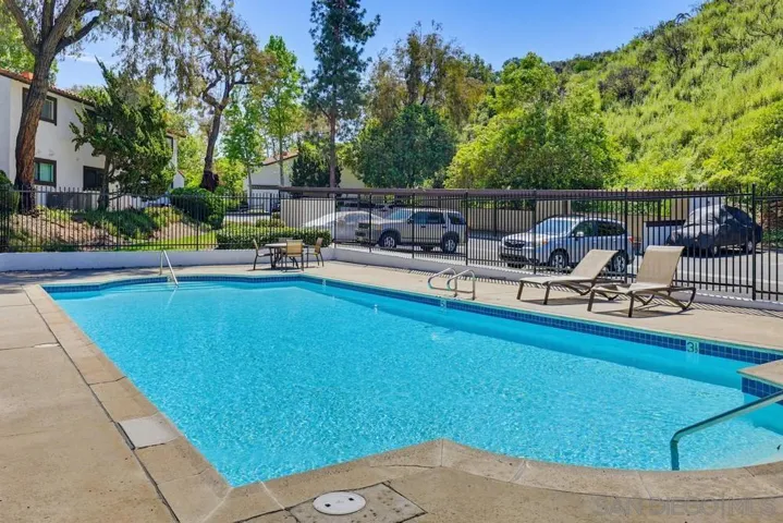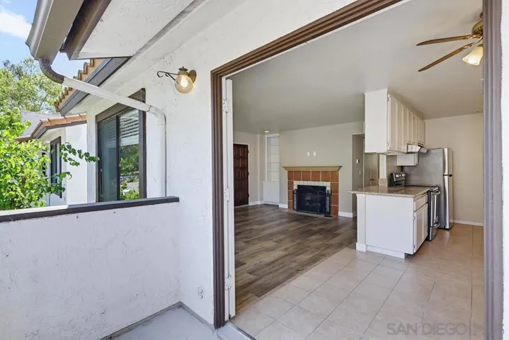 Upgraded Condo in the College area and within walking distance to SDSU. Welcome home to this bright and inviting top-floor 2 bedroom, 2 bathroom condo located in the desirable Collwood Meadows community. This move-in ready home offers an open and functional floor plan with abundant natural light throughout. The living room features a built-in bookcase and a cozy wood-burning fireplace accented by Spanish-inspired tile and a charming wood mantel. The space flows seamlessly into the dining area, creating the perfect setting for relaxing or entertaining. Beautiful hardwood laminate flooring runs through the main living areas, complemented by faux wood blinds and ceiling fans. The galley-style kitchen is thoughtfully designed with granite countertops, stainless steel appliances, tile flooring, and recessed lighting—ideal for everyday cooking or hosting guests. The spacious primary suite offers dual closets with double doors and an ensuite bathroom featuring a large granite-top vanity with a dedicated makeup area and a tiled shower. Additional highlights include a full-sized hallway laundry closet, forced air heating and newer air conditioning(replaced in 2021), and a private patio with a convenient storage closet. Nestled within the tree-lined Collwood Meadows community, residents enjoy lush green spaces along with a community pool and spa. Located just minutes from San Diego State University/College area with easy access to freeways, popular restaurants, shopping, and nearby parks, this home offers both comfort and convenience in a prime location.