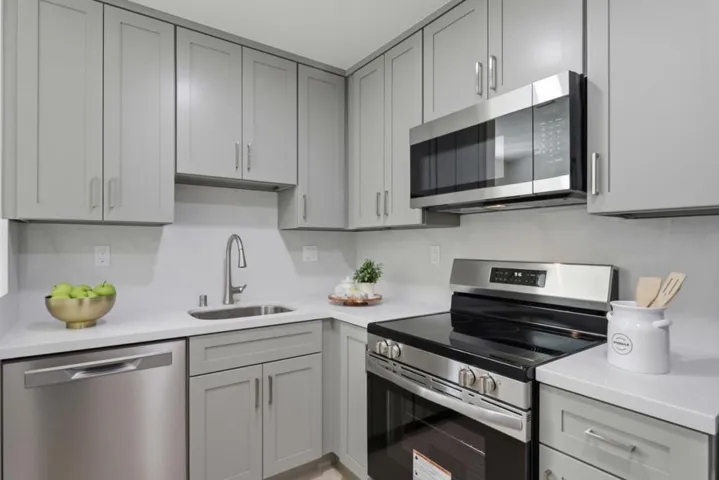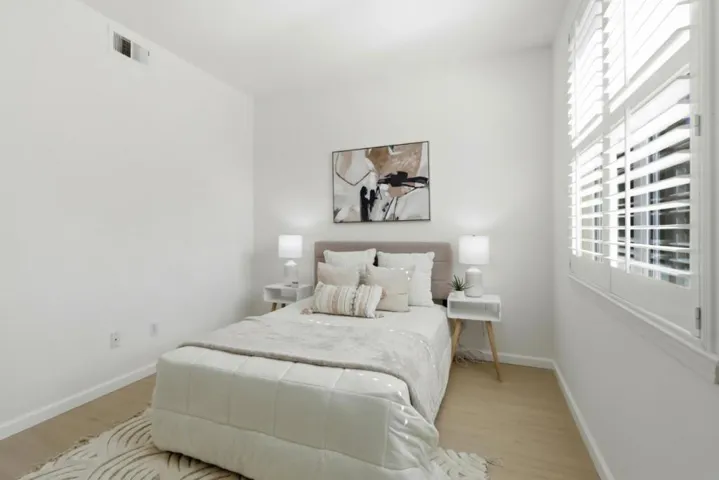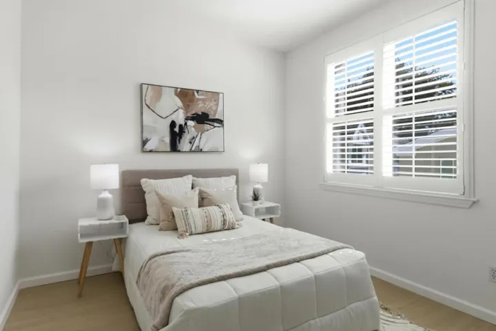 Move-in ready and extensively remodeled townhome in a prime Sunnyvale location. Built with solid concrete walls, ceilings, floors, and stairs, this home offers enhanced durability, sound insulation, and a sense of structural quality. Fresh interior paint, new laminate flooring throughout including staircase, recessed lighting, high ceilings and plantation shutters. Central heating and A/C with a Google Nest thermostat, provide efficient year-round comfort. Private balcony off the main living area perfect for relaxing or morning coffee. Remodeled kitchen showcases quartz countertops, solid wood cabinetry, new stainless steel appliances, new sink, faucet and pantry storage. Remodeled half bath on the main level with new vanity, sink, modern fixtures, and toilet. Upstairs, the primary suite features a remodeled bath with quartz stall shower, dual-sink quartz vanity, updated fixtures, new flooring, new toilet, and walk-in closet. Secondary suite includes remodeled bath with new tub, quartz vanity, updated fixtures, new flooring, new toilet, and walk-in closet. Freshly painted two-car side-by-side garage with new polymer floor coating. Conveniently located near downtown Sunnyvale, Caltrain, Central Expressway, Highways 101 & 237, shopping, dining and major tech corridors.