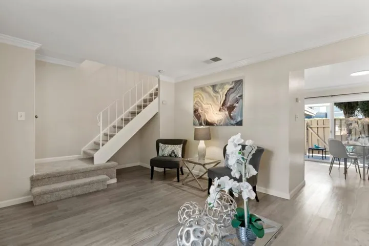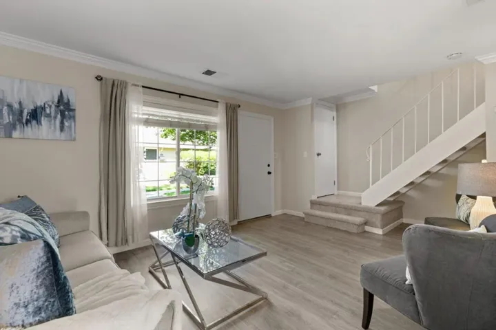 Welcome home to this end-unit townhome in Blossom Valley, where Coy Park sits right across the street offering open green space, a playground, and walking pathways just steps from your front door. Picture morning strolls and quiet evenings in a peaceful, established neighborhood that instantly feels like home. This rare find offers the privacy of a detached home, with neither bedroom sharing a neighbor’s wall and a guest bath downstairs! Zoned to top-rated Hayes Elementary (8/10) and just blocks from Oak Grove High School, the location checks every box. The flexible layout offers two large bedrooms and a full bath upstairs, while the spacious living room and open kitchen flow seamlessly to a private patio below, ideal for everyday living and summer hangouts. A convenient guest bath on the ground level welcomes visitors with ease. Two dedicated carport spaces with bonus storage sit conveniently off the patio. Inside, enjoy fresh new paint throughout, an updated kitchen, updated main bath, new carpets, and new lighting, all move-in ready with indoor washer and dryer included. The HOA covers the big-ticket exterior items including roof, siding, gutters, perimeter fence, and exterior painting, so you can simply move in and enjoy. This is Blossom Valley living at its best!