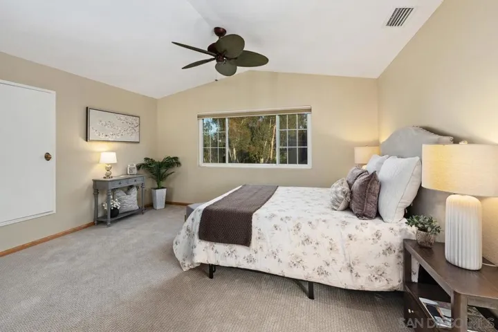 Situated on a nearly ¼-acre flat cul-de-sac lot backing to a private canyon with serene, park-like views, this home offers a beautifully landscaped, resort-style backyard with artificial turf, mature fruit trees, and an expansive Trex deck (2020) ideal for outdoor living and entertaining. Inside, the open floor plan features formal living and dining rooms with oak hardwood flooring, a separate library/den with gas fireplace, and an expanded great room with wood-burning fireplace, built-in entertainment center, surround sound, and window seating. The chef’s kitchen includes top-of-the-line appliances, Taj Mahal quartz countertops, custom cabinetry with roll-out drawers, new wood flooring (2024), a breakfast nook, and French doors to the backyard. A downstairs bedroom (currently an office) with custom built-ins is adjacent to a spa-inspired bath. Upstairs offers fresh carpet and paint, a spacious primary suite with dual closets and additional storage, an upgraded bath, and two secondary bedrooms. Additional highlights include owned solar, major system updates, and a 2-car garage with built-ins. Conveniently located near Sorrento Valley, UCSD, beaches, freeways, shopping, and dining.