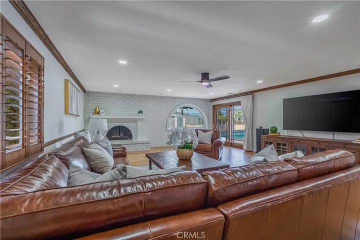 The expansive kitchen is thoughtfully designed as the heart of the home, featuring custom cabinetry, granite countertops, double sinks, built-in microwave/oven combo, cooktop, dishwasher, and a generous breakfast bar. The kitchen opens seamlessly to the oversized family room. The family room offers a cozy fireplace, vaulted ceilings, recessed lighting, and direct access to the backyard.