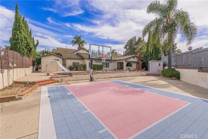Additional amenities include a basketball court, RV parking with automatic gated access, 220V charging capability, two storage sheds, a separate dog run, and a dedicated exterior bathroom for the pool. The property also offers ample parking.