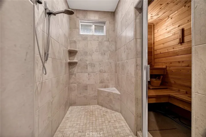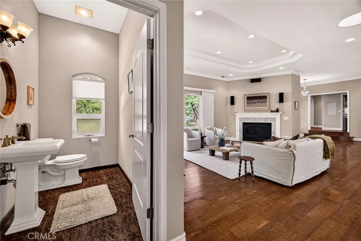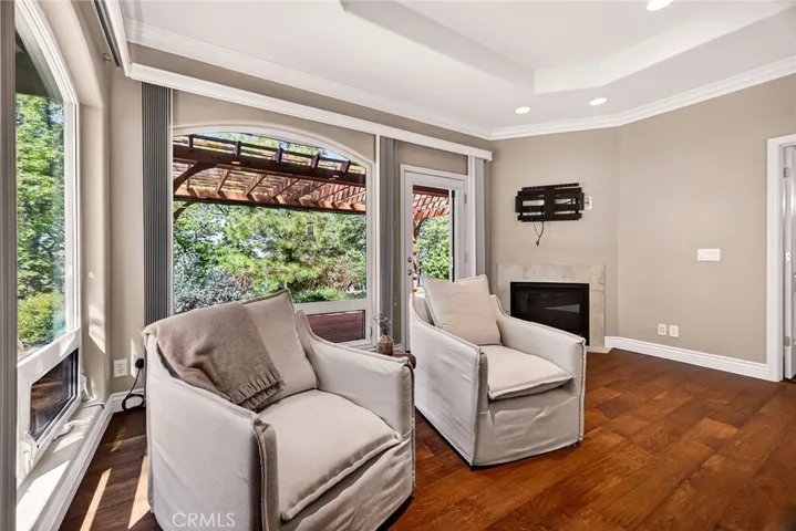The primary suite offers a true sanctuary—complete with its own fireplace, custom reading lights, and a spa-inspired bathroom appointed with granite surfaces, dual vanities, and a private sauna. Rich wood flooring extends through the main living areas and primary suite, creating timeless continuity and warmth.