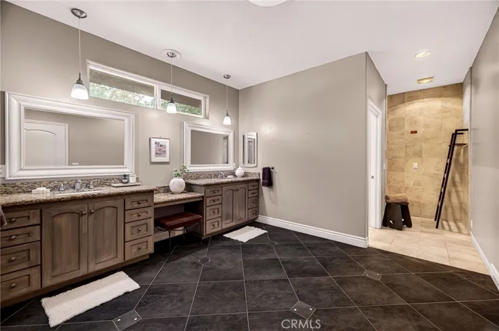 The great room exudes warmth and style with its granite-tiled fireplace and integrated surround sound system—an inviting space ideal for both intimate evenings and elegant entertaining. The gourmet kitchen is a chef’s dream, featuring a striking leather granite island, granite tile countertops, a gas cooktop, oversized single-basin sink, appliance garage, and abundant custom cabinetry with pull-out drawers. A dedicated bar and desk area seamlessly merge functionality and design.