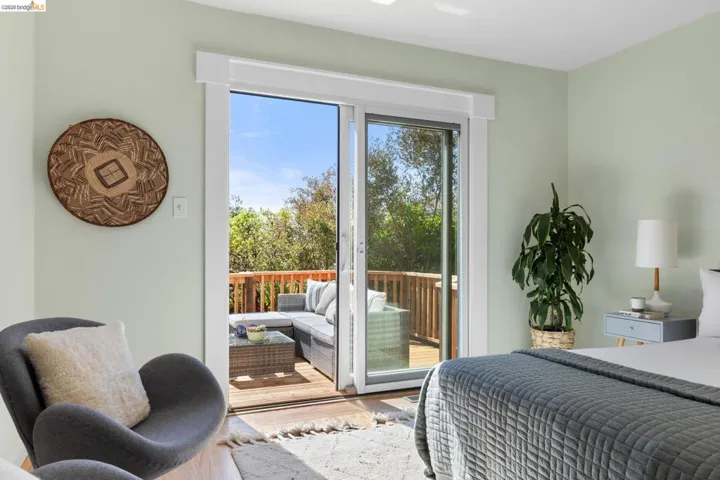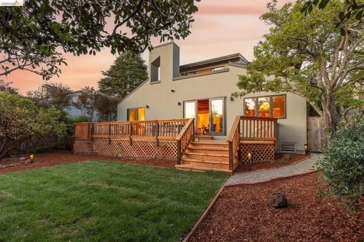 Set at the edge of nature in a coveted neighborhood, 260 Grizzly Peak Blvd offers refined contemporary living with lovely views. A charming front yard with vibrant landscaping and a classic brick pathway leads to a welcoming porch adorned by climbing pink roses. Inside, an expansive living room features exposed wood ceilings, light hardwood floors, a brick fireplace, and seamless access to a flat, grassy yard with a redwood deck, fruit trees and plantings – ideal for indoor-outdoor living. The updated kitchen includes stone countertops, Heath tile backsplash, wood cabinetry, and a Bertazzoni range, all opening to a bright dining area, perfect for entertaining friends and family while hosting countless celebrations! The main level offers two bedrooms – including one with access to back yard – and a stylish hall bath with vintage Heath tile. Upstairs find a two additional bedrooms – both with views – and a second bathroom. The airy primary suite boasts vaulted ceilings, skylight, large balcony, and beautiful City and Bay views. Don’t miss the oversized laundry room or attached two car garage. Located near Tilden Park and Kennedy Grove trails, and just .6 miles to Kensington Hilltop Elementary School along the “Ye Olde School Path – this is a special place to call home!