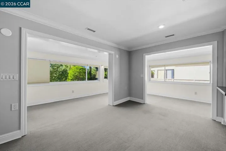 Welcome to 2741 Golden Rain Rd #7, a spacious upper-level Sequoia Wrap 2BD/2BA co-op offering approx. 1,466 sq ft in the sought-after 55+ Rossmoor community. The open living and dining area is filled with natural light and features a fireplace and built-in entertainment center. A covered balcony spans the home, providing a peaceful outlook and space for outdoor seating or dining. The updated kitchen includes modern appliances, ample cabinetry, and a large breakfast bar/island. A versatile bonus room offers flexibility for an office, reading, or exercise space. The primary suite features an expansive closet and ensuite bath with dual vanities, bidet, and walk-in shower with seating. The second bedroom includes a Murphy bed for added flexibility. Nearby is a bath with large vanity and walk-in shower. Additional features include dual-pane windows, skylights, generous storage, and a private parking space and cabinet ideal for golf clubs or seasonal items. There’s also a community gathering space nearby. Rossmoor offers golf, fitness, pools, tennis, trails, clubs, and more. Buyer must qualify. Monthly HOA dues. Minutes to downtown Walnut Creek, shopping, dining, and freeway access.