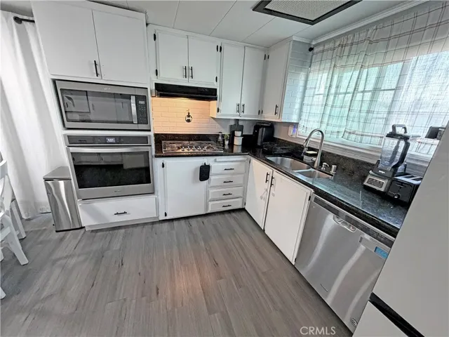 The interior showcases a modern, sleek design with clean lines and updated finishes. The upgraded kitchen complete with granite counters, stainless steel appliances opens into the dining area with large built in storage. The open living area creates a functional and inviting space. Recent renovations include full bathroom remodel, flooring, painting, kitchen counters and appliances, inside laundry hookups. The exterior of the home includes a entertainers patio, artificial turf, gym area, covered carport parking along with two storage sheds. Located in a wonderful family park known as Lone Hill Manor which offers a pool, spa, billiard room, community center, BBQ and picnic area, sport court and is all close to shopping, dining, and schools. This move-in ready home truly has it all. Conveniently located near shopping, dining, and freeway access.
