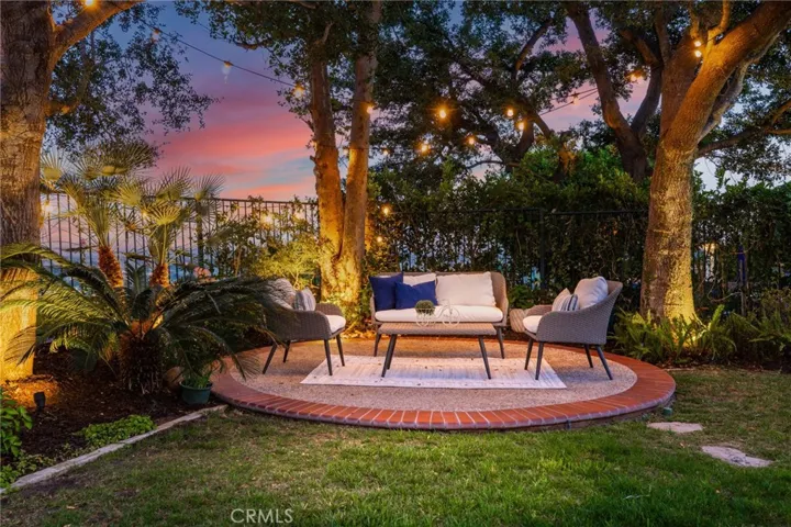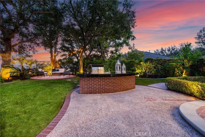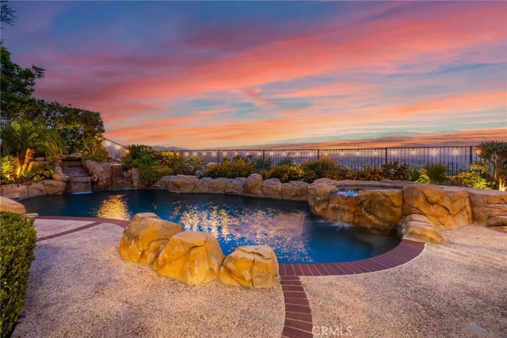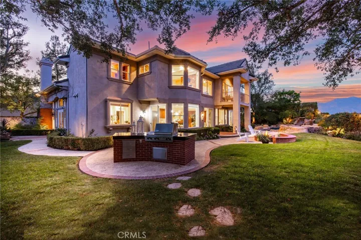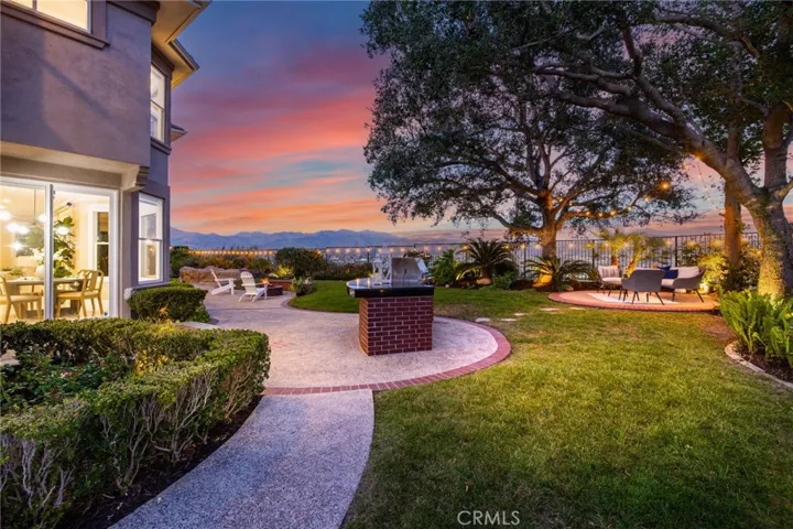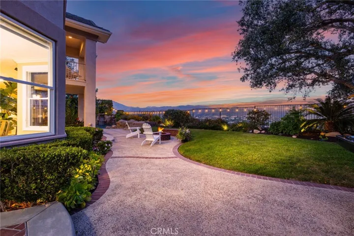 Step outside into an entertainer’s dream backyard featuring a pool and spa, BBQ island with counter seating, fire pit, lawn area, and multiple patio spaces. Surrounded by blooming flowers and mature landscaping, the garden creates a peaceful setting with unobstructed mountain and valley views.