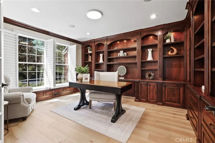 The main level includes a private executive office with built-ins and a guest suite with ensuite bath, ideally positioned with views of the backyard garden, pool, and mountains, along with convenient access to the outdoor space.