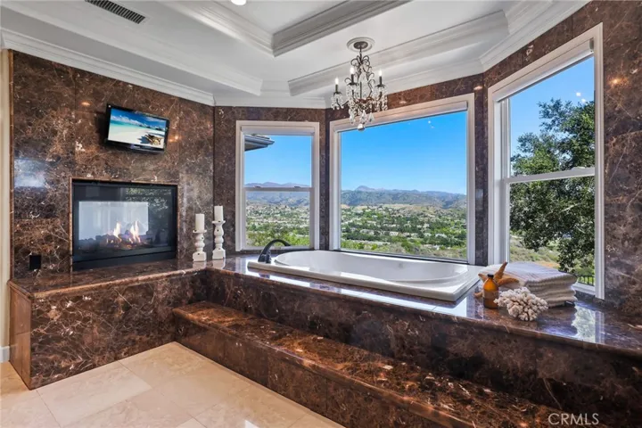 Upstairs, the expansive primary suite offers panoramic views of the Coto de Caza Valley, a double-sided fireplace, and a spa-inspired bathroom with dual vanities, vanity area, and a large walk-in closet. Four additional bedrooms provide flexibility for guest rooms, bonus room, gym, or office.