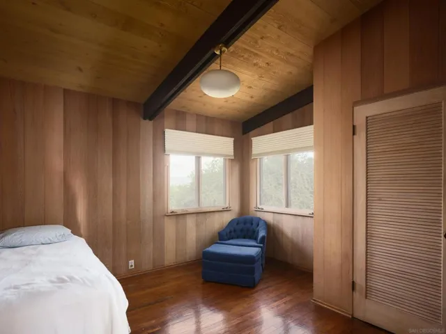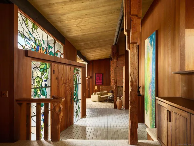 FIRST TIME ON THE MARKET! This mid-century modern tour de force is the result of a unique collaboration between client, architect (Sim Bruce Richards) and artists (James Hubbell and Rhoda LeBlanc Lopez). This cedar and glass beauty engages its 1.09-acre parcel through expanses of glass in every room. Whether relaxing poolside or entertaining guests indoors, the home frames views of the eastern hills and mountains. Colors illuminate the interior spaces through stained glass, skylights and pendant lighting by Hubbell, while both fireplaces feature Lopez’s sculptural bricks. A remarkable opportunity to purchase an architectural work of art in the heart of Mount Helix.