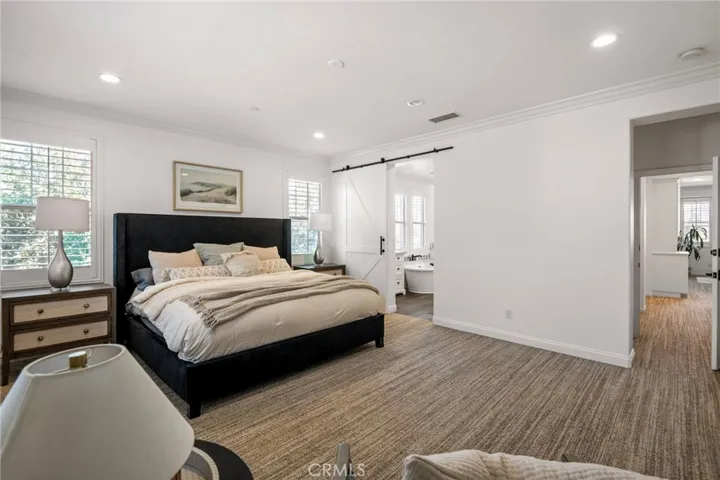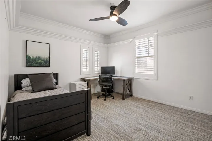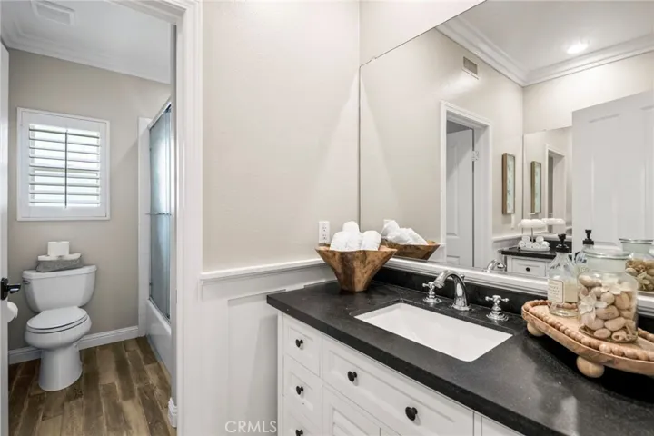 Located in the coveted San Lucar neighborhood of Talega, this residence features sophisticated finishes throughout, including elegant crown molding, custom casings, and designer plantation shutters adorning dual-pane windows. Enhancing its value is a fully paid-off solar system. The culinary wing offers a designer main kitchen featuring champagne bronze hardware, a custom hood vent, and a large porcelain farmhouse sink. Premium appointments include granite countertops, under-cabinet lighting, a gas cooktop, a built-in refrigerator, and double ovens. Tucked away from the main kitchen is a rare scullery or prep suite equipped with a sink, full-size refrigerator, additional mini-fridge/beverage cooler, microwave, quartz countertops, and cabinetry. The primary bedroom/sanctuary includes a spa-inspired en suite with a freestanding soaking tub, double vanities with marble countertops, and a floor-to-ceiling shower featuring a rain head, handheld wand, and triple body jets. The bespoke walk-in wardrobe features integrated storage systems and custom cabinetry, while a seamless full-length mirror opens to reveal a cedar-lined hidden closet for fine woolens and seasonal attire. Private guest accommodations are located downstairs, featuring a bedroom with custom built-ins and a private en suite with a walk-in shower. Additional living spaces include two expansive downstairs living areas, each anchored by a cozy fireplace, and a versatile second-story loft with custom built-in storage. A designer laundry room is conveniently located upstairs with quartz countertops, custom cabinets, and a utility sink.
