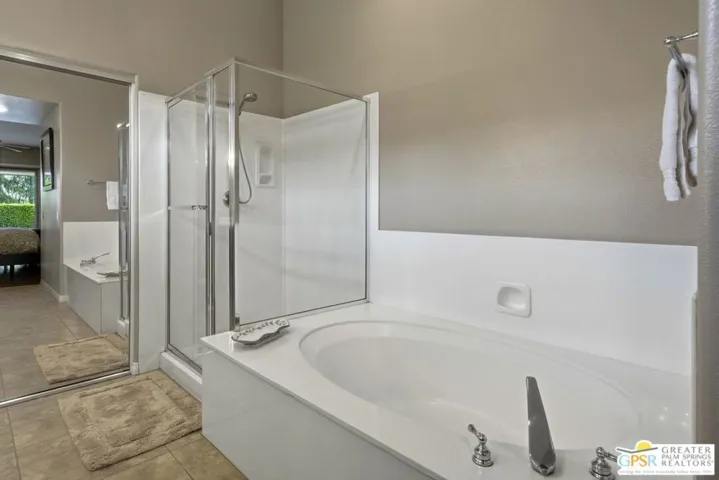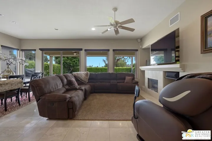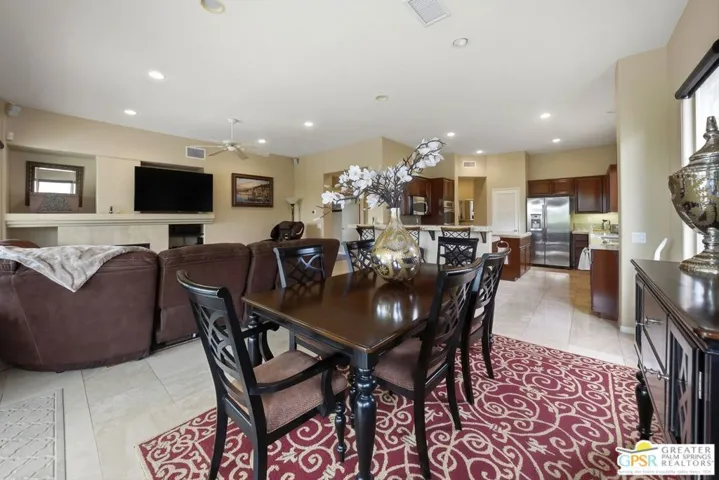 Welcome to 149 Kavenish Drive East. Wide-open floor plan showcasing stunning travertine flooring, a gourmet island kitchen with granite countertops, stainless steel appliances, and designer wall finishes throughout. The sumptuous primary suite offers a private retreat with pool and spa views, direct outdoor access, and an expansive walk-in closet. This exceptional residence features three bedrooms and three bathrooms, with lavish interior spaces that are elegantly appointed and thoughtfully designed truly indicative of a remarkable home. High ceilings, custom window coverings, ceiling fans, and a security system enhance both comfort and sophistication. Impeccably furnished with curated decor, multiple flat-screen TVs, and fine artwork, the home delivers a turnkey luxury experience. Located in the newer freestanding phase with no common walls, it includes an attached two-car garage plus dedicated golf cart space and direct access into the home. The outdoor living area is equally impressive, featuring a private Pebble Tec pool and spa, pool cooler, commercial-grade misters, built-in BBQ, and panoramic views of rolling fairways and the mountains. Club amenities include 4 community pools and spas. Enjoy 24-hour security, privacy, and seclusion all embraced by a refined desert lifestyle. A true contemporary jewel. This beautiful home comes fully furnished, per Inventory.