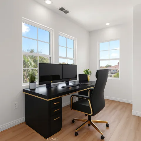 The floor plan is designed for today’s families and tomorrow’s needs, featuring two master bedrooms and three dedicated office spaces for modern living, remote work, or multi generational use. The spacious bedrooms include oversized walk-in closets, and the central patio, balcony, and three car garage add comfort, utility, and architectural presence. Natural light fills the home, highlighting luxury vinyl flooring and a freshly remodeled interior.