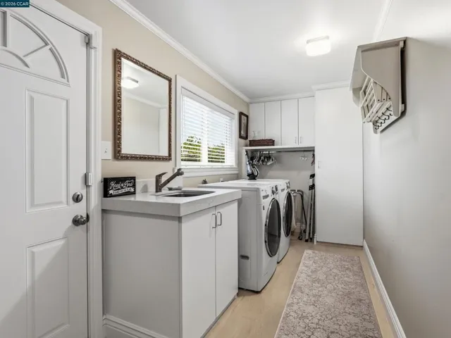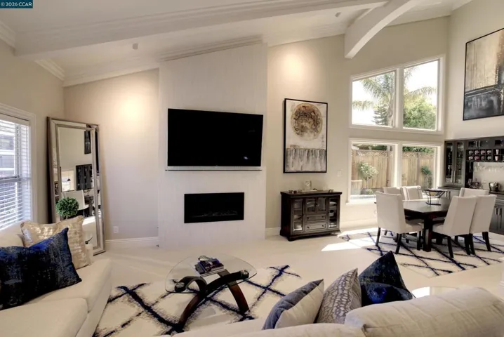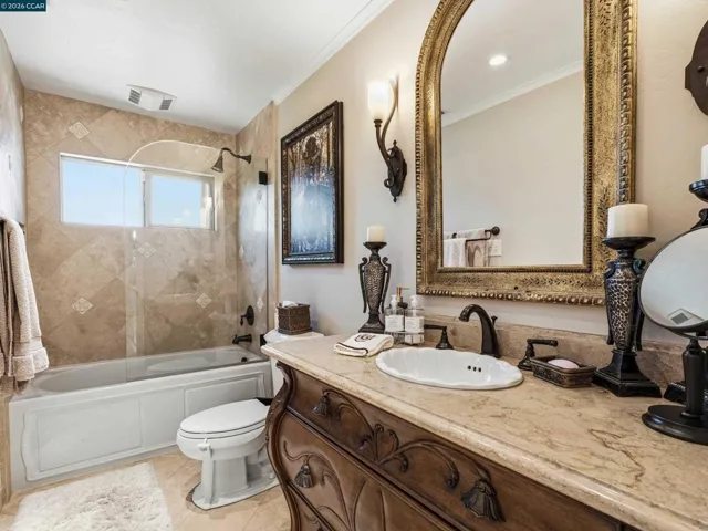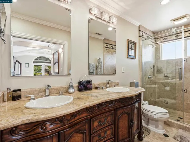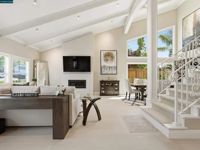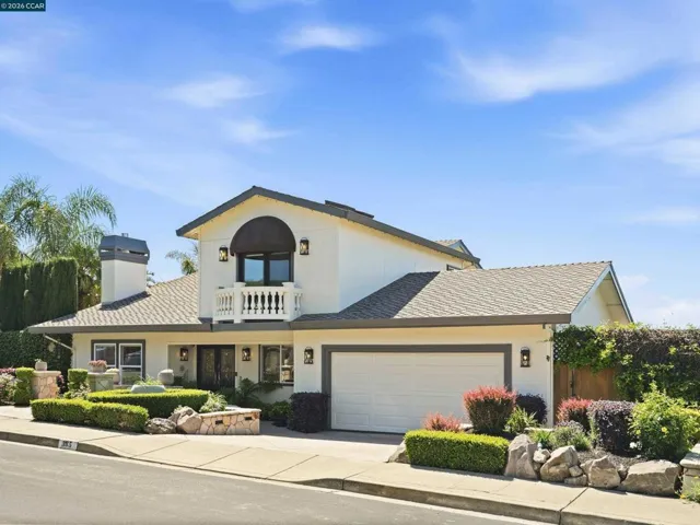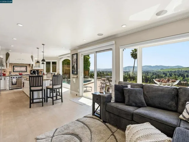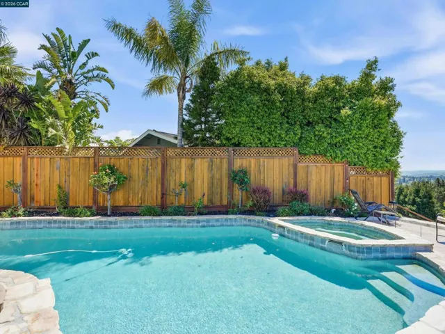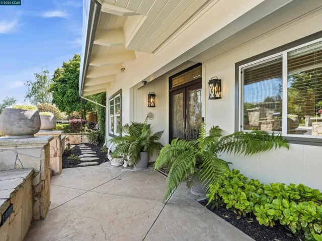 Million dollar valley views! Rarely does a home of this caliber come to market. Impeccably maintained with an extraordinary level of care, this stunning residence offers refined living. Showcasing four bedrooms and three full baths, including a highly desirable main-level ensuite. This home is filled with natural light and timeless architectural detail. Expansive living spaces are enhanced by beam ceilings wrapped in crown molding, custom built-ins and a gas fireplace with electric start-creating a warm yet sophisticated ambiance. The heart of the home, features white cabinetry, granite countertops, a generous center island with seating for six to eight, dual stainless steel sinks and a six burner professional grade gas range/oven. The luxurious primary suite is a peaceful retreat, highlighted by four skylights, walk-in closet and an opera-style terrace that adds architectural charm. The rear of the home unveils it’s most extraordinary feature–breathtaking180 degree view of Las Trampas hiils, creating a stunning backdrop with a spa that spills into the solar heated pool, while the downslope reveals a charming vineyard adding a touch of wine country living. Well-appointed laundry offers buit-in storage and deep basin sink. Close proximity to top-rated schools, parks & playground