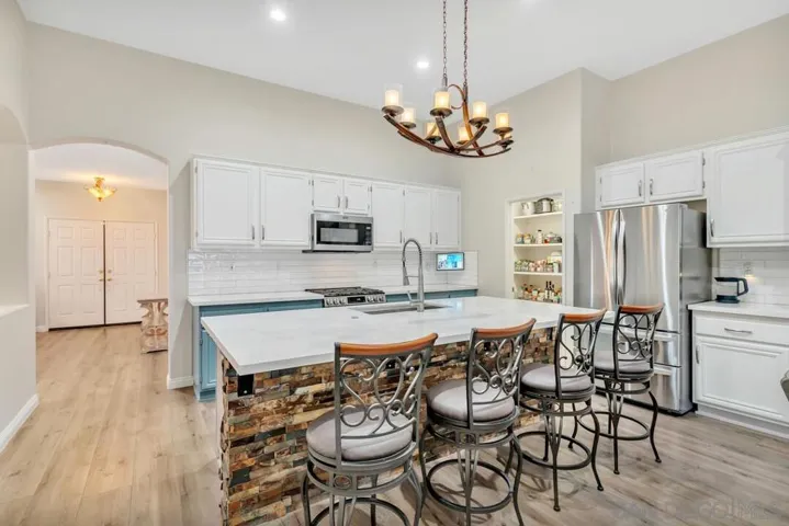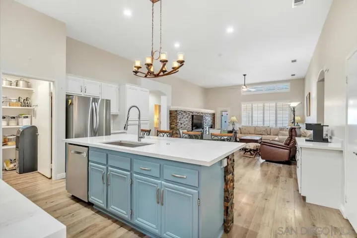 Beautifully upgraded single-story home with Low Mello-Roos & No HOA! This 4-bed, 2-bath residence with 3-car garage offers an open and inviting layout with high ceilings, a double door entry, and seamless flow between living spaces. The remodeled kitchen is the heart of the home, featuring quartz countertops, a spacious island with designer stone detail, newer appliances, farmhouse sink, custom cabinetry with pull-out drawers, full-height tile backsplash, under-cabinet lighting, and dual pantry spaces including a large custom-built storage area. The kitchen opens to the family room with a cozy fireplace, custom stone accents, recessed lighting, and abundant natural light enhanced by tinted windows and shutters. Throughout the home you’ll find thoughtful upgrades including hand-blown glass light fixtures, recessed lighting, and plantation shutters. The primary suite offers a relaxing retreat with a spa-inspired bathroom complete with a fully remodeled shower and tub, dual showerheads including a rain feature, custom tile work, new fixtures, and a spacious walk-in closet with built-in organization. Enjoy indoor-outdoor living with a large covered Alumawood patio & beautifully maintained yard with lining palm trees & low maintenance turf. Located on a quiet cul-da-sac this home is a must see!