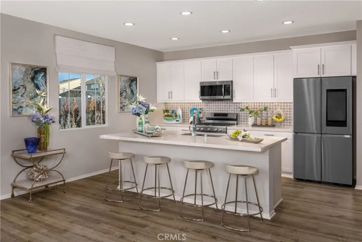 This two-story home features an open-concept layout with a spacious great room flowing into a well-appointed kitchen with an Oceania quartz countertop, large kitchen island, ample storage, and Samsung gas appliances.