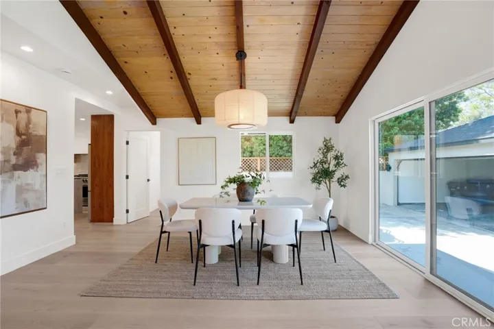 Set on a quiet Westchester street, 8121 Chase Ave has been completely reimagined with a focus on clean architecture, natural light, and elevated, thoughtfully selected finishes throughout. A dramatic vaulted great room anchors the home, framed by exposed wood beams and wide-plank engineered hardwood flooring, creating a warm yet modern living space that feels both open and intentional. Large sliding doors line the back wall, seamlessly connecting indoor living to the private backyard and filling the home with natural light. The kitchen was designed as a true centerpiece—featuring custom walnut cabinetry, a statement waterfall island, integrated appliances, and a refined mix of textures that strike the perfect balance between modern and timeless. Bathrooms carry a spa like feel, highlighted by clean-lined tile work, warm wood vanities, and understated brass accents. Each space reflects a cohesive design approach that feels elevated without being overdone. Beyond the main living areas, a detached 200 sq ft bonus flex space off the back of the garage offers versatility for a home office, gym, studio, or creative workspace—adding meaningful functionality to the property. The exterior mirrors the interior’s design sensibility with smooth stucco, black-framed Milgard windows, and fresh, curated landscaping that gives the home a quiet, confident presence. With a well executed layout, designer finishes, and seamless indoor outdoor flow, this is a home that delivers both style and livability in one of Westchester’s most desirable pockets.
