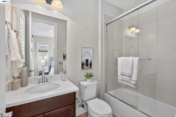 Welcome to this rare NW-facing, en-suite gem in prestigious Mosaic at Gale Ranch – 4 bedrooms, 4 full baths, and 2,501 sqft of uncompromising luxury. Boasting nearly $100K in designer upgrades including fresh paint, new upstairs carpet, and custom tile flooring on the main level. The open-concept 1st floor features a chef’s kitchen with granite countertops, oversized island with bar seating, built-in stainless appliances, custom cabinetry, and recirculating water heater for instant hot water. A private downstairs bedroom with full bath is ideal for guests or multi-gen living. Upstairs, all bedrooms have private en suite baths and walk-in closets, including two light-filled bedrooms with Juliet balconies. The primary retreat features custom built-ins, dressing room, and a spa-like bath with dual sinks, soaking tub, and walk-in shower. A versatile loft with potential for 5th bedroom and easy 2nd-level laundry complete the upper floor. An enclosed stone patio offers a private, low-maintenance escape with citrus trees and roses, ideal for relaxing or entertaining. Residents enjoy the Mosaic Recreation Center, clubhouse, pool, Mosaic, Creekside and Quail Run Parks, and Iron Horse Regional Trail. Located in SRVUSD near Quail Run Elementary, Gale Ranch Middle and Dougherty Valley High.