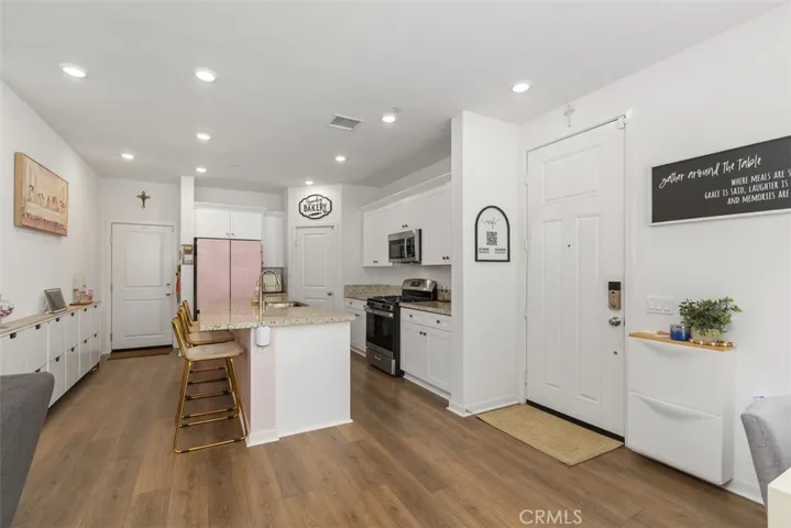 Corner unit 2024-built townhome in the Towns community of Winchester. Plan 2 floor plan with loft featuring an open-concept main level with kitchen, dining, and living areas. Kitchen includes quartz countertops and white shaker cabinetry.