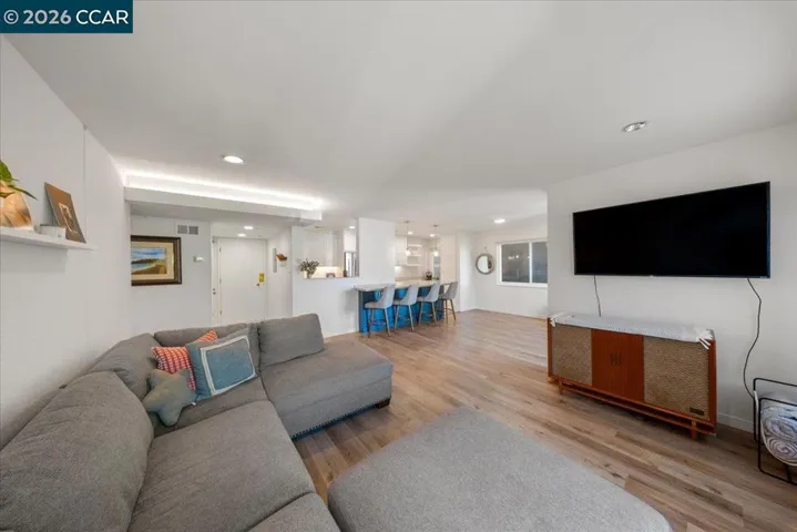 Beautifully updated 2-bedroom, 2-bathroom end-unit condo (1,119 sq ft). This bright, move-in-ready home floods with natural light thanks to its premium end-unit location and extra windows, plus a private balcony offering peaceful views of trees and the skyline for relaxing evenings. Both bedrooms are spacious, with the primary featuring a generous walk-in closet. The home boasts a spacious open floor plan seamlessly incorporating the fully remodeled kitchen with bar seating for informal meals, an inviting family room, and a dedicated area for a dining table for more formal occasions. Pride of ownership shines through with recent upgrades: luxury vinyl plank flooring and new high-efficiency heater (2020), stunning new dual-sink vanity in the primary bath with updated plumbing (2022), and a complete kitchen remodel (March 2025) featuring all-new stainless appliances, upgraded exhaust fan with custom ducting, and a fully relocated electrical panel with increased capacity — all permitted and city/HOA approved. Asbestos and lead tests confirmed clean. Rare bonus: two assigned garage parking spaces. Enjoy the community pool, secure building, and prime location near Lake Merritt, Grand Ave, Piedmont, and Uptown. Turnkey living at its best! www.330vernonst.com