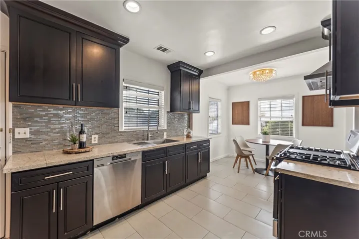Inside, the home showcases a spacious living room with a quartz-faced fireplace and recessed lighting, creating a warm and inviting setting. The adjoining dining area flows into a galley-style kitchen featuring newer granite countertops, stainless steel sink, tile backsplash, dark cabinetry, and stainless steel appliances.
