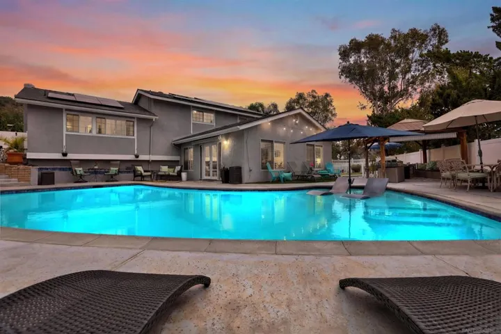 Exceptional Southwest Poway location in the highly sought-after Poway Portals neighborhood; set on a peaceful 1/3 acre, cul-de-sac lot. This inviting split-level home features a gorgeous “Farmhouse” kitchen w/huge island, soft-close doors/drawers w/ample storage and opens up to the 23’x23’ Great Room. Durable/easy-maintenance Tile flooring throughout the entire main level. The Primary Bedroom & spacious Living Room (at the mid-level) feature high ceilings, large picture windows (bringing in abundant natural light), and a striking white brick woodburning fireplace. The Primary Bath has been updated w/herringbone tile floors, white cabinetry, mirrored triple closet doors, separate shower/toilet room w/Barn Door for privacy. The Upper-Level houses all three secondary Bedrooms and Bathroom; featuring fun black & white tile floors, dual sinks, ample storage & another space-saving Barn Door. Additional upgrades include: Freshly painted interior & exterior, brand new concrete driveway, brand new HVAC System, Newer Roof & Fully PAID-FOR Solar, resurfaced (pebble-finish) Pool w/Baja Shelf, Newer Pool Equipment, Dual-Pane Windows, Whole House Fan, Ceiling fans in All Bedrooms & Family Room. The spacious backyard offers low-maintenance landscaping; Artificial Turf, raised planters w/drip irrigation, Vinyl Fencing, several entertaining areas; including a large Gazebo to escape the Sun. Ample parking; including room for your Boat and/or RV (w/clean-out). The Oversized, attached 2-car garage has room for a workshop/extra storage, etc. Laundry is located in the Garage. No HOA/No Mello Roos & within the award-winning Poway Unified School District. Save on Gas & enjoy ALL the benefits of Poway without the drive! Less than five miles from the I-15 FWY; close to shopping, parks, hiking & biking trails (Iola Trailhead), AND just 30-minutes to the Beach! There is SO MUCH to uncover in this spectacular home – come see for yourself!