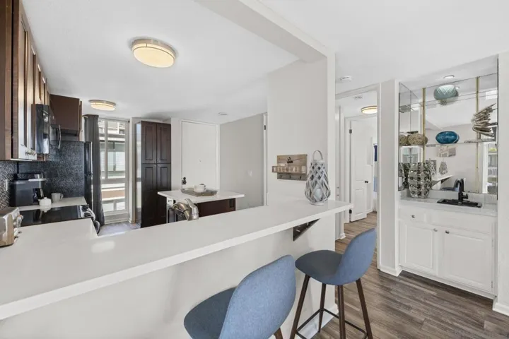 You’re practically on top of the waves as you gaze at the sunset from your oceanfront home – a mere 42 feet from the sand! This spectacular, west facing 2 bedroom, 2 bath, upper unit “cottage-style” condominium has been remodeled with designer cabinets, upgraded counters and appliances, and a glass tile backsplash. Enjoy more stunning ocean views from the primary bedroom & balcony. The A Building has its own heated pool & spa, barbecue, and laundry facilities. 24-hr guarded, gated security. Additional amenities include gym, saunas, billiards, ping pong, & putting green. HOA dues now include 500 speed Cox Internet and 200 HD television channels. And it’s sold furnished!