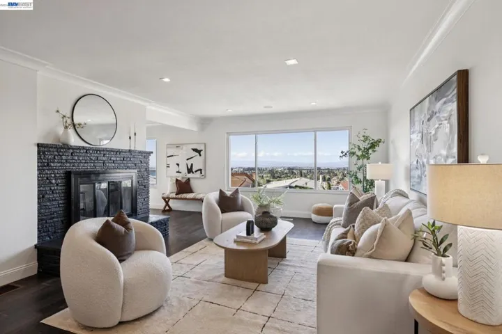 Surrounded by beautiful East Bay regional parks, this completely remodeled Mid-Century 3BD/2BA home offers stunning San Francisco Bay views in Oakland’s hillside neighborhood of Chabot Park. The stylish 1672 SQFT home enjoys picture windows that stream sunshine into the living and dining rooms and frame Bay views as the backdrop to your life – from downtown SF to far down the peninsula. Relax in front of the fireplace or entertain in the dining room. Recessed lighting and hardwood floors span into the upgraded eat-in kitchen with a large island, a wall of extra countertop space, and stylish cabinets. Cooking is easy as friends and family gather around the bar seating or in the breakfast nook. Downstairs find interior access to the two-car garage and laundry area. The three bedrooms are tucked away in the sleeping wing for privacy. The primary suite features backyard views, a spacious closet, and a gorgeous bath with dual vanity and towel warmer. Two bedrooms have roomy, custom closets and share a chic, modern hall bath. The giant backyard and patio offers plenty of room to unwind, garden, dine al fresco, and play. Out your front door, Oakland Zoo and miles and miles of trails are only blocks away, or golf, fish, or take the dog out at Chabot Park. Bonus: Sewer lateral compliant!