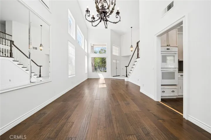 Perfect location for the Northbridge Valencia 5 bedroom pool home on a rare cul-de-sac! Open floorplan with soaring ceilings upon entry with huge super family room. The 4-car garage option from the builder was not taken – instead there is a 5th room (office/no closet) and full bath downstairs. Upstairs there are 4 good-sized bedrooms, one of which is oversized. The primary also has double walk-in closets. Fresh paint throughout and nice improvements include wood floors, wainscot/crown molding, granite counters/island in kitchen, stainless appliances, walk-in pantry and distressed cabinets. Nice yard with large, covered patio plus pool/spa and BBQ. Mature trees create privacy and the location can’t be beat! Close to parks, pools, the clubhouse and award winning Helmers Elementary (2023 Distinguished School Award) all for one low HOA and no Mello Roos taxes. This is what makes Northbridge so popular – centrally located and with amazing amenities at a low cost. Come home to Valencia!